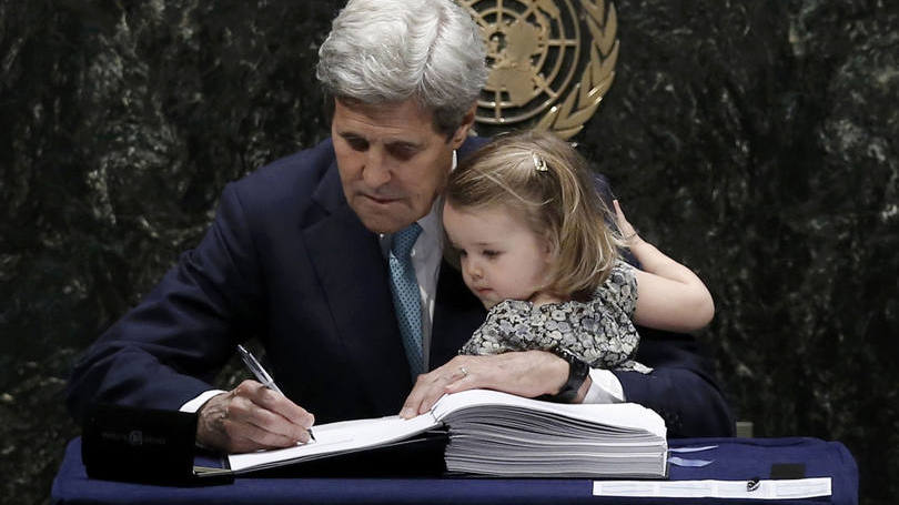 China e Estados Unidos estiveram representados, respectivamente, pelo vice-premiê Zhang Gaoli e o secretário de Estado americano John Kerry. Este último assinou o acordo com sua neta em seus braços e foi muito aplaudido.