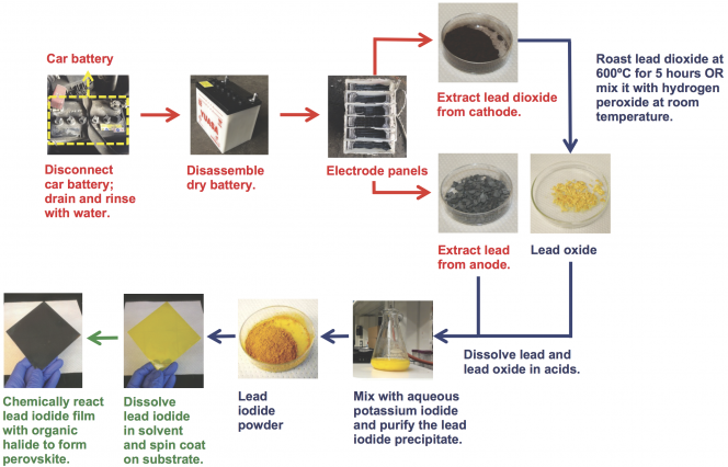 baterias de um carro práticas que possam beneficiar tanto o meio ambiente ea saúde humana. À medida que novas baterias de carro sem chumbo entrar em uso, as baterias velhas seria enviado para o setor de energia solar ao invés de aterros sanitários. E se a produção deste novo e de alta eficiência, baixo custo da célula solar leva off-como muitos especialistas acham que vai-fabricantes aumento da demanda "para o chumbo poderiam ser satisfeitas sem mineração de chumbo adicional e fundição. Experiências laboratoriais confirmam que as células solares feitas com chumbo reciclado trabalho tão bem como aqueles feitos com elevado grau de pureza, disponível comercialmente materiais de partida. Reciclagem de baterias poderia, assim, apoiar a produção destas células solares inovadoras enquanto pesquisadores trabalham para substituir a liderança com um material mais benigna, mas igualmente eficaz.