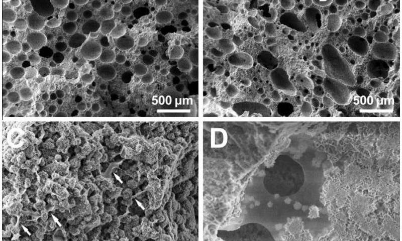 Por mais de um século, os cirurgiões têm usado vários tipos de cimentos de fosfato de cálcio (CPCs) para reparar ossos que foram danificados devido ao trauma, que tem funcionado muito bem para uma variedade de circunstâncias. Uma área onde eles não têm funcionado bem, no entanto, tem sido na reparação óssea que degenerou devido a doenças como a osteoporose. O problema tem sido que CPCs convencionais são microporosos, macroporosos, mas não-é a diferença no tamanho das cavidades de ar dentro do material. Para ser útil para a reparação de ossos que foram degenerados, as cavidades precisa ser maior do que 50 nanómetros. Neste novo esforço, a equipa de investigação relata que a espuma que tenham desenvolvido atende a esse critério.