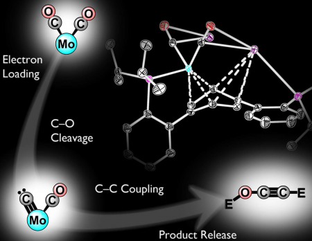 Esta clivagem resulta na formação de um carboneto de-um único átomo de carbono terminal ligado a um centro de metal-que subsequentemente faz uma ligação com a segunda molécula de CO coordenados ao metal. Embora um carboneto é comumente proposto como um intermediário na redutiva acoplamento CO, esta é a primeira demonstração directa de seu papel neste tipo de química, os pesquisadores. Após a formação da ligação C-C, o centro metálico liberta o produto C2. Em geral, este processo converte as duas unidades do co a um derivado etinol e prossegue facilmente, mesmo a temperaturas mais baixas que a temperatura ambiente.
