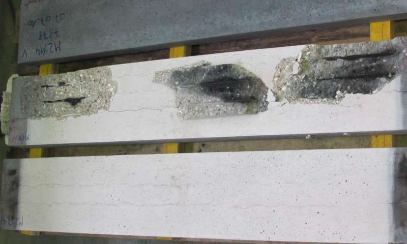 Pesquisadores da Laboratories "Concreto / Construção Química" e "Engenharia de Sistemas Mecânicos da Empa" já conseguiu encontrar uma resposta. Eles fabricaram uma série de lajes de concreto com paredes finas que foram protendido com cabos feitos de fibra de carbono reforçado polímero. O betão a partir da qual as placas foram feitas também continha 2 kg de fibra de PP por metro cúbico de mistura. Em alguns lajes os cientistas também adicionada uma pequena quantidade de polímero super-absorvente (SAP), um material sintético especial que é capaz de absorver muitas vezes o seu próprio peso em água. Eles, então, expôs as lajes de concreto para disparar, atingindo temperaturas de até 1.000 ° C. Após 90 minutos, ficou claro que, embora as lajes de concreto contendo SAP mostrou algumas pequenas rachaduras, fragmentação ocorreu somente nas lajes de livre-SAP.