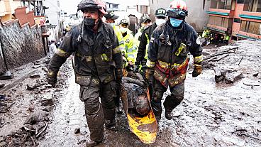 Imagens da derrocada mostraram ondas de lama, com cerca de 3 metros de altura, transportando veículos, caixotes do lixo e outros destroços sob uma chuva intensa, na segunda-feira à noite, nos bairros de La Gasca e Armero, nas encostas da montanha Ruco Pinchincha.