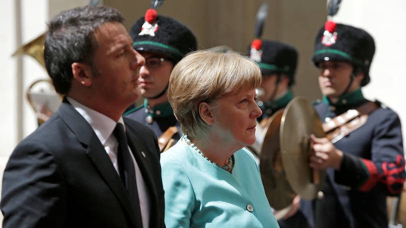 A chanceler alemã, Angela Merkel, abre oficialmente as reuniões com um encontro com o primeiro-ministro italiano, Matteo Renzi, na sede do governo.