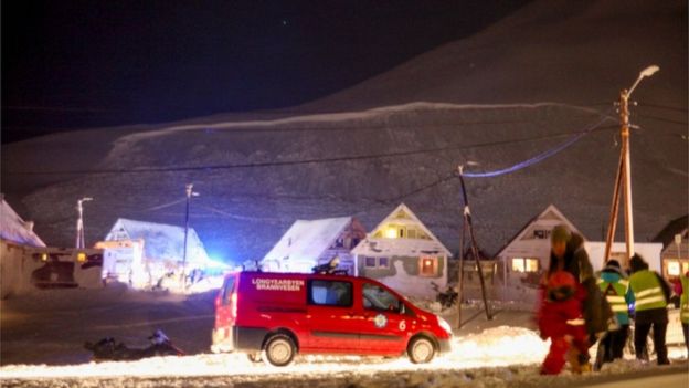 Ele enviou a neve e o gelo arremessado para baixo Monte Sukkertoppen em Longyearbyen, uma cidade de 2.000 pessoas, às 11:00 (09:00 GMT) após uma tempestade durante a noite feroz.