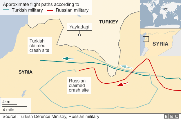 A Rússia diz que o avião foi abatido no espaço aéreo sírio. O presidente Vladimir Putin descreveu a ação da Turquia como uma "punhalada nas costas" cometido por "cúmplices de terroristas".