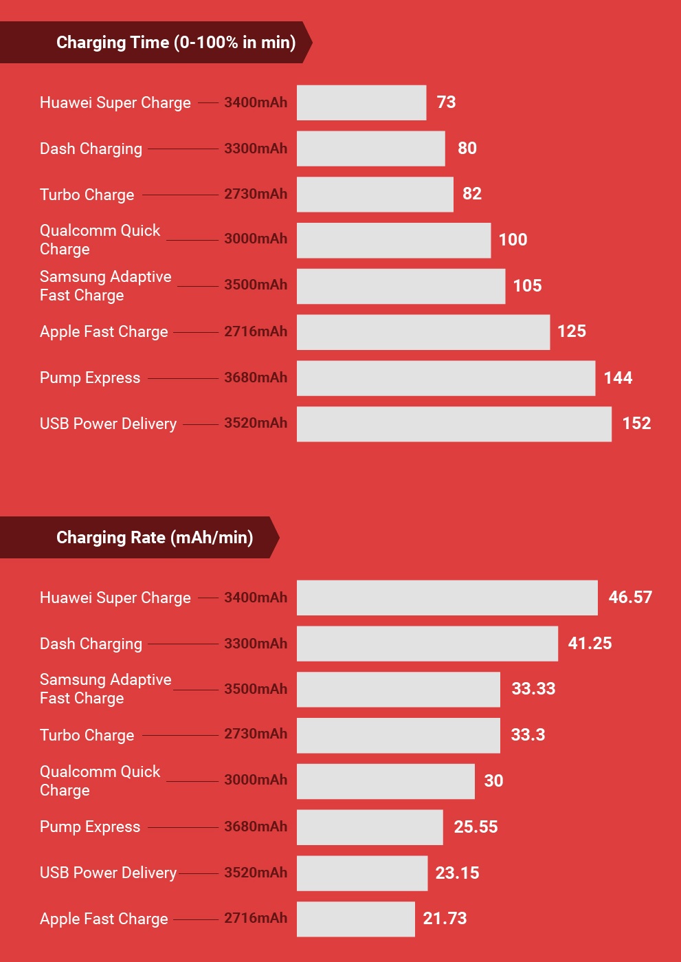 O SuperCharge da Huawei foi o que obteve o melhor desempenho, bastando 73 minutos para carregar o Honor 10 com uma bateria de 3400 mAh, batendo o OnePlus 6 e o Dash Charge, que demorou 80 minutos. Segui-se o Turbo Charge, da Motorola, que demorou 82 minutos para carregar o Moto Z2 Force, enquanto o iPhone X demorou 125 minutos a carregar totalmente.