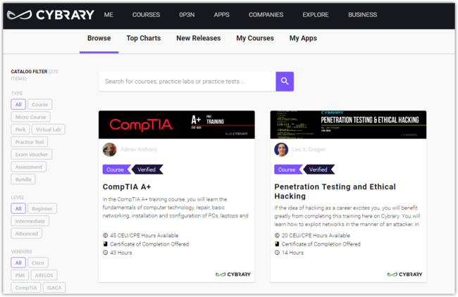 Os cursos do Cybrary, que contém acompanhamento vídeo em larga escala, são na sua grande maioria gratuitos, existindo a possibilidade de obtenção de um diploma no final da realização do curso.