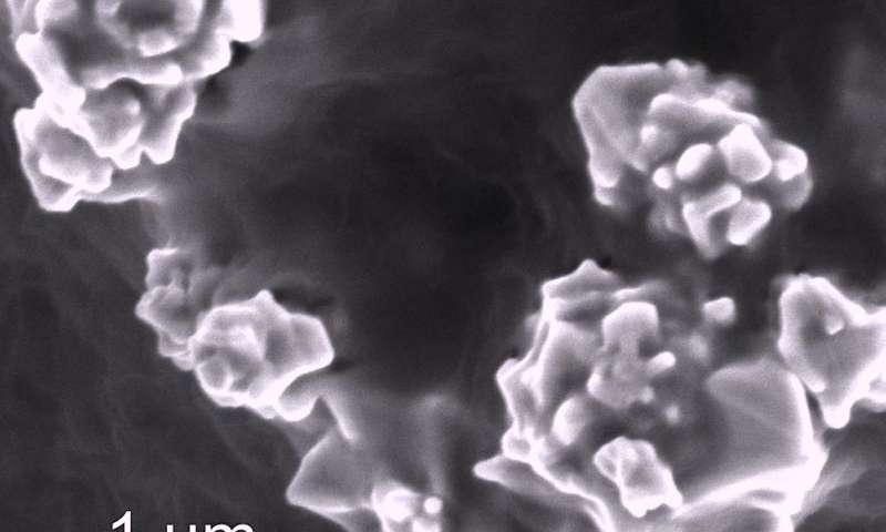 Para a experiência da bateria, os investigadores partículas de níquel revestido com grafeno pontiagudas, uma camada de espessura de átomo de carbono, e as partículas incorporado num filme fino de polietileno elástico.